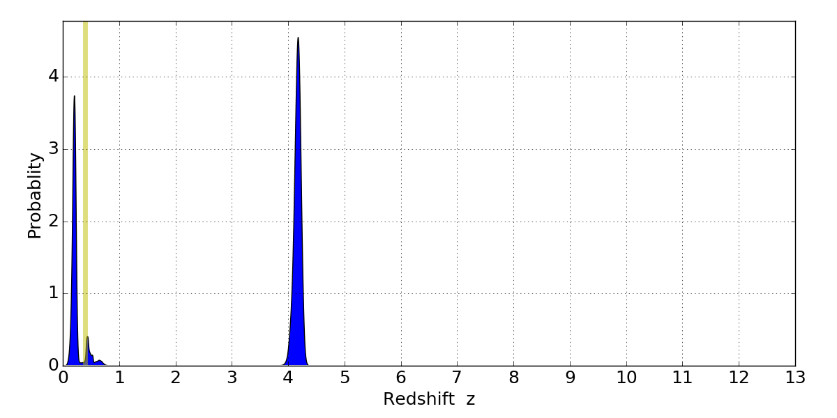 In P(z) plots: Yellow lines mark the cluster redshift z = 0.396,