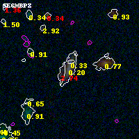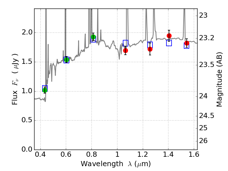 Object #2056   x,y = (1452, 2950)   RA, Dec = (00:32:15.672, 18:08:19.68) = (8.06530, 18.13880)   BPZ = 0.195 [0.125--0.259]   type = 9.50 (SB3_B10 - SB2_B10)   chisq2 = 0.44   ODDS = 0.86   z_cluster = 0.396