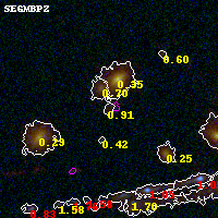 Black segments are analyzed here. Roll mouse over color images to view segments. Best viewed in a wide browser window (1200 pixels or more). Download SED & P(z) plots to view larger versions.