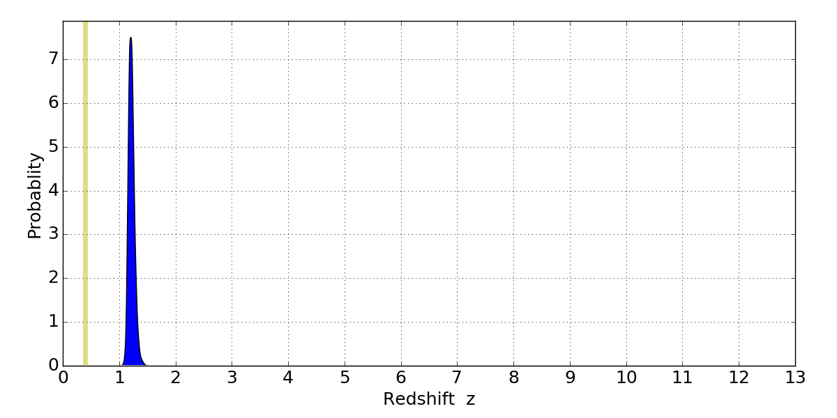 In P(z) plots: Yellow lines mark the cluster redshift z = 0.396,
