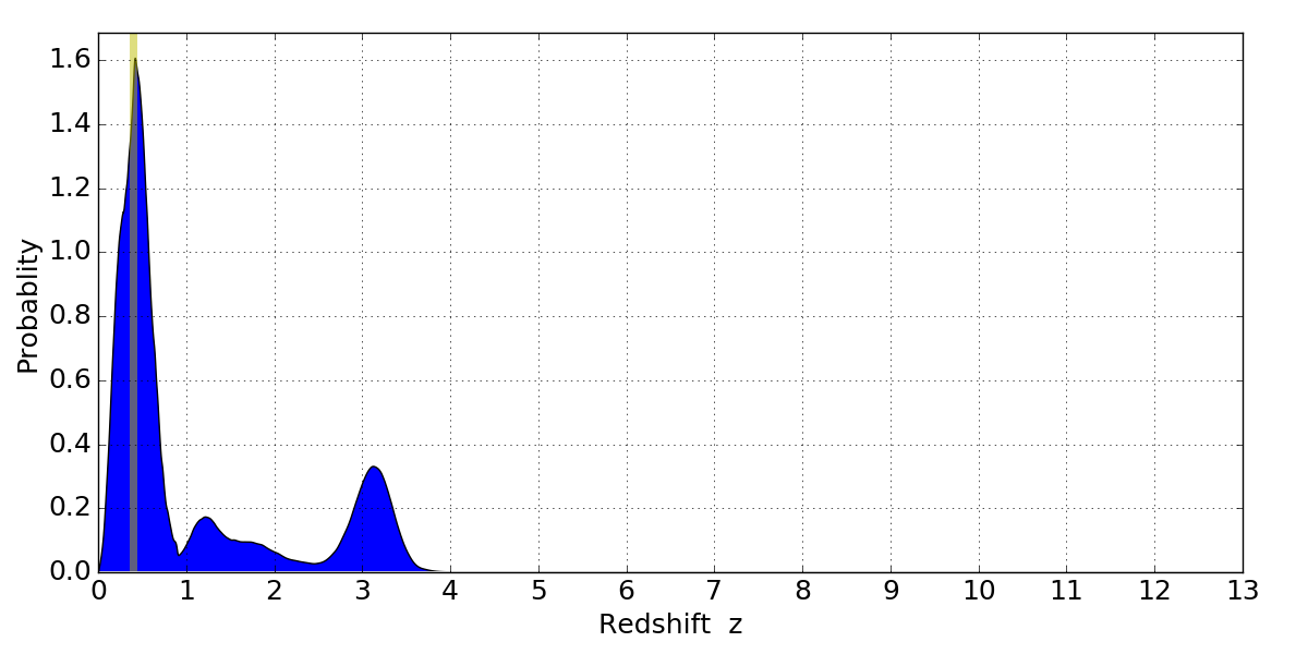 In P(z) plots: Yellow lines mark the cluster redshift z = 0.396,