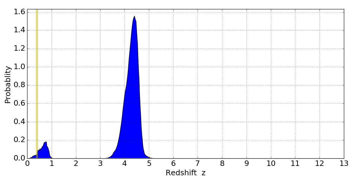 In P(z) plots: Yellow lines mark the cluster redshift z = 0.396,