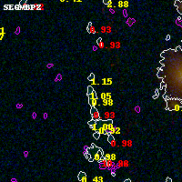 Object #3998   x,y = (1569, 1892)   RA, Dec = (00:32:15.168, 18:07:16.32) = (8.06320, 18.12120)   BPZ = 1.053 [0.455--1.976]   type = 9.10 (SB2_B10 - SB3_B10)   chisq2 = 0.03   ODDS = 0.18   z_cluster = 0.396