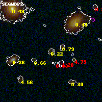 Object #4142   x,y = (1806, 1816)   RA, Dec = (00:32:14.184, 18:07:11.64) = (8.05910, 18.11990)   BPZ = 0.222 [0.078--3.330]   type = 9.40 (SB2_B10 - SB3_B10)   chisq2 = 0.47   ODDS = 0.21   z_cluster = 0.396