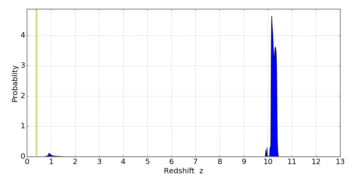 In P(z) plots: Yellow lines mark the cluster redshift z = 0.396,