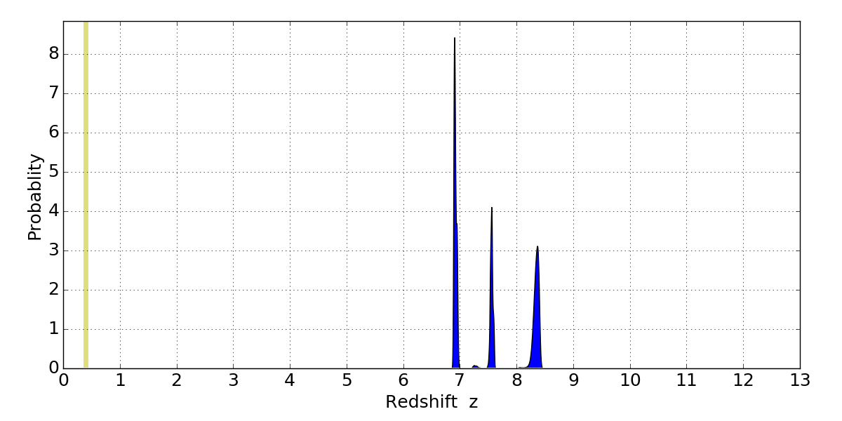 In P(z) plots: Yellow lines mark the cluster redshift z = 0.396,