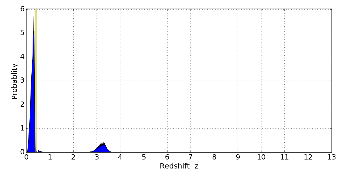 In P(z) plots: Yellow lines mark the cluster redshift z = 0.396,