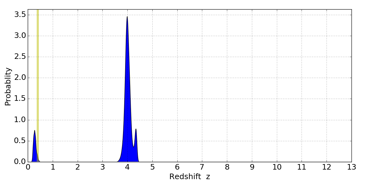 In P(z) plots: Yellow lines mark the cluster redshift z = 0.396,