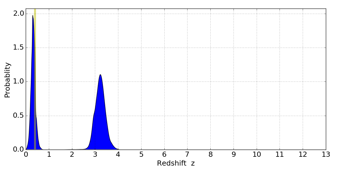 In P(z) plots: Yellow lines mark the cluster redshift z = 0.396,