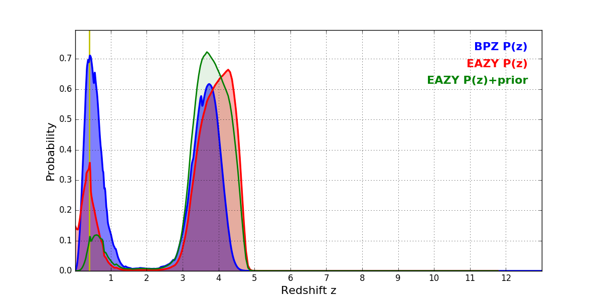 In P(z) plots: Yellow lines mark the cluster redshift z = 0.396,