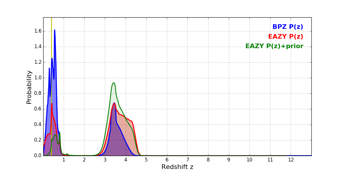 In P(z) plots: Yellow lines mark the cluster redshift z = 0.396,