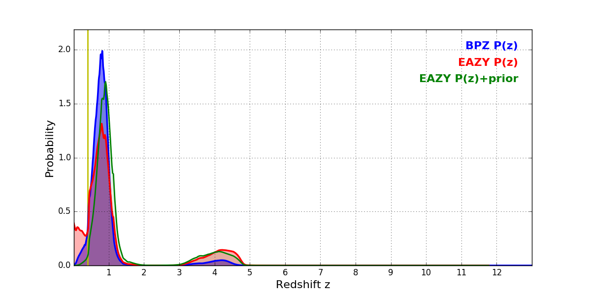 In P(z) plots: Yellow lines mark the cluster redshift z = 0.396,