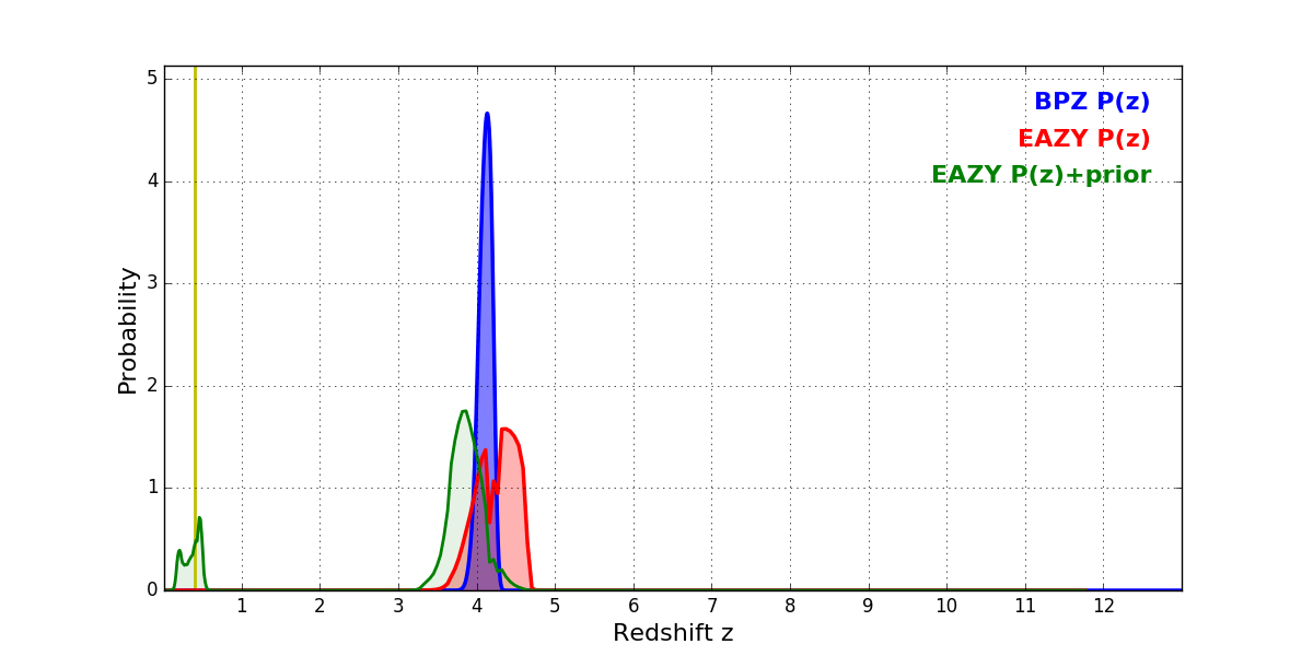 In P(z) plots: Yellow lines mark the cluster redshift z = 0.396,
