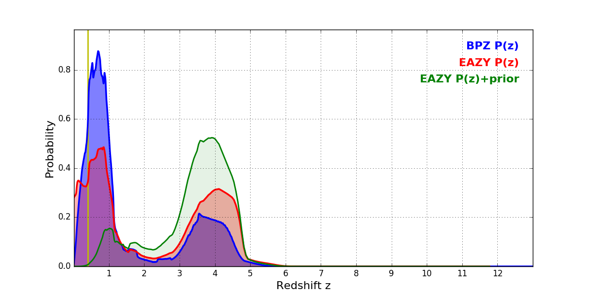 In P(z) plots: Yellow lines mark the cluster redshift z = 0.396,