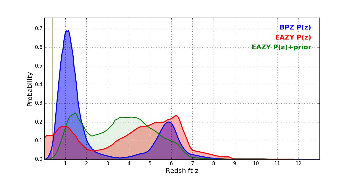 In P(z) plots: Yellow lines mark the cluster redshift z = 0.396,