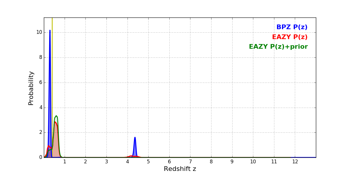 In P(z) plots: Yellow lines mark the cluster redshift z = 0.396,