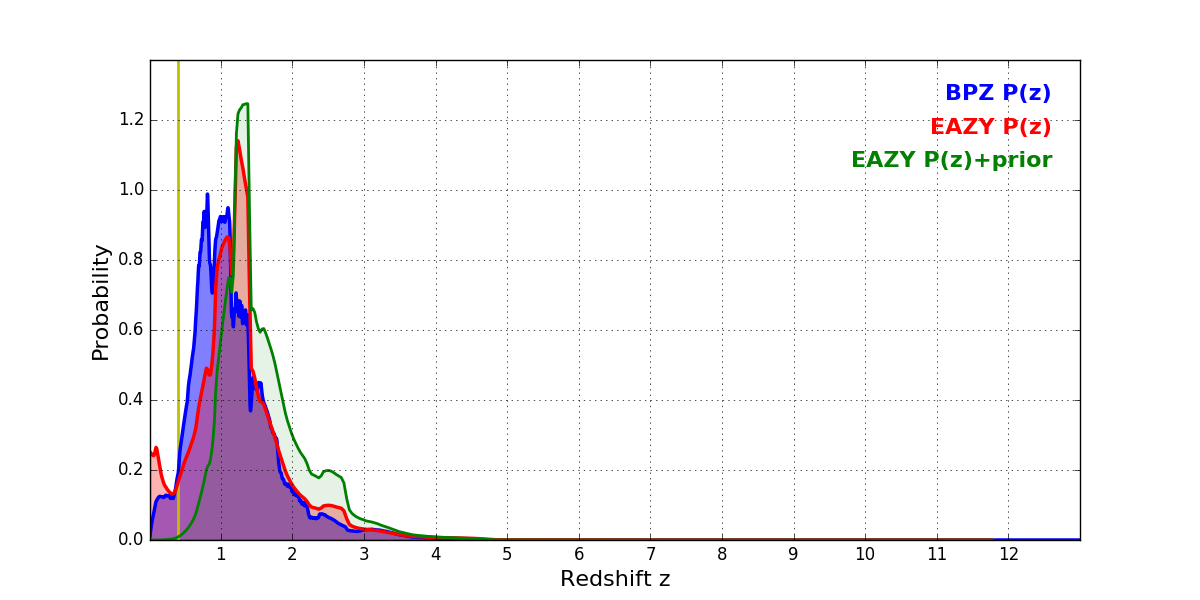 In P(z) plots: Yellow lines mark the cluster redshift z = 0.396,