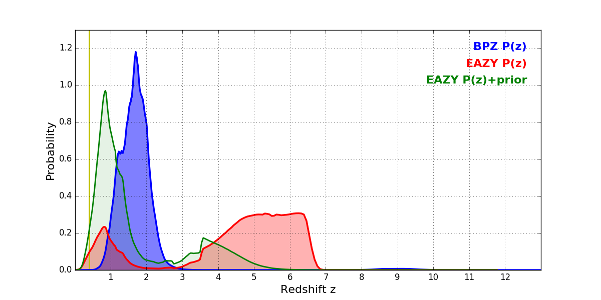 In P(z) plots: Yellow lines mark the cluster redshift z = 0.396,