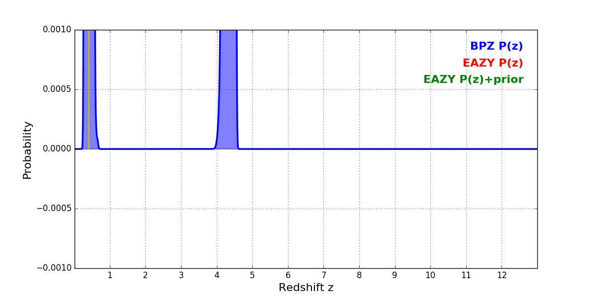 In P(z) plots: Yellow lines mark the cluster redshift z = 0.396,
