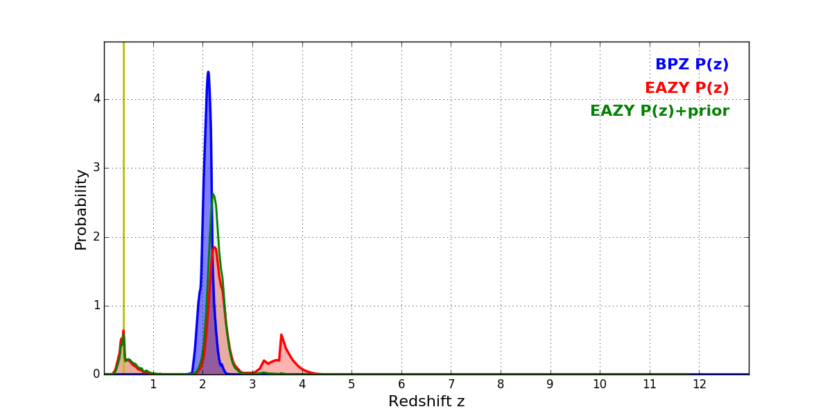 In P(z) plots: Yellow lines mark the cluster redshift z = 0.396,