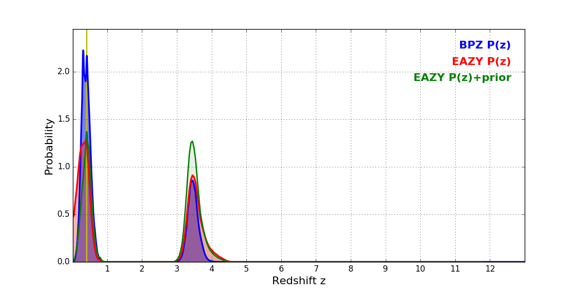 In P(z) plots: Yellow lines mark the cluster redshift z = 0.396,