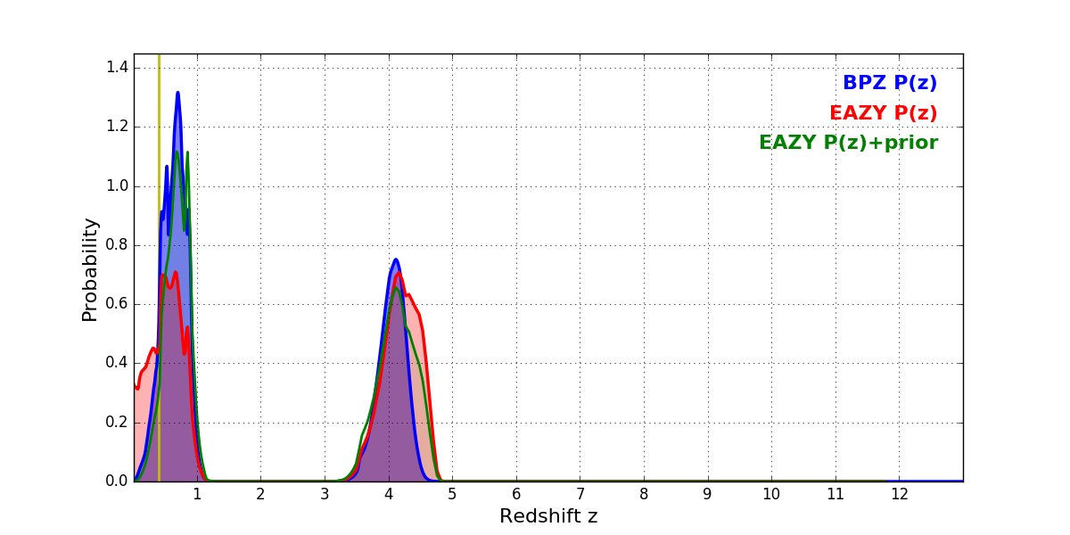 In P(z) plots: Yellow lines mark the cluster redshift z = 0.396,