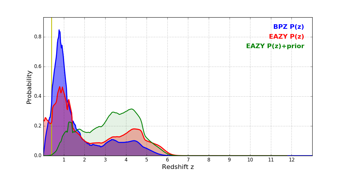 In P(z) plots: Yellow lines mark the cluster redshift z = 0.396,
