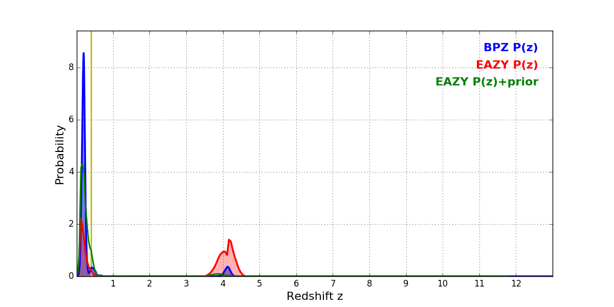 In P(z) plots: Yellow lines mark the cluster redshift z = 0.396,