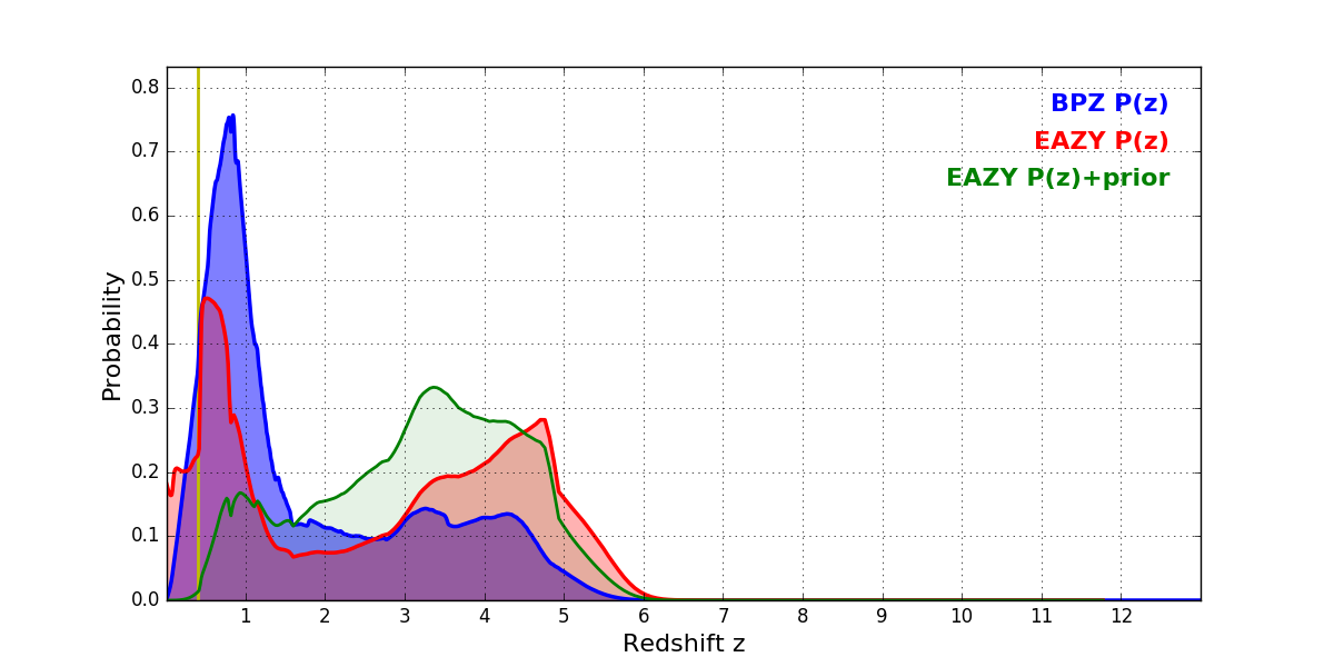 In P(z) plots: Yellow lines mark the cluster redshift z = 0.396,