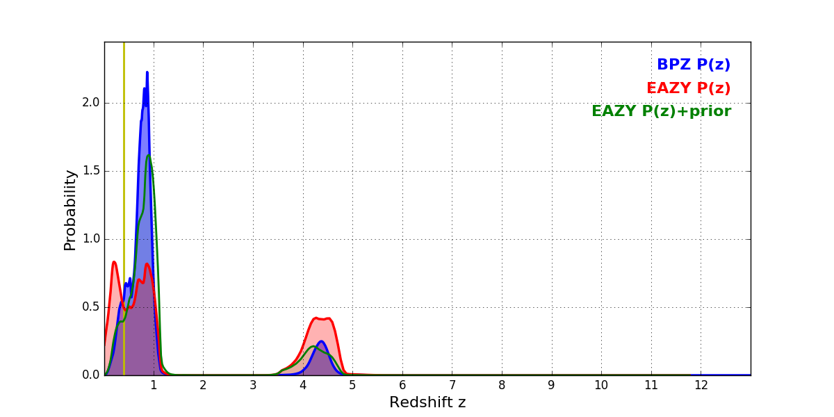 In P(z) plots: Yellow lines mark the cluster redshift z = 0.396,
