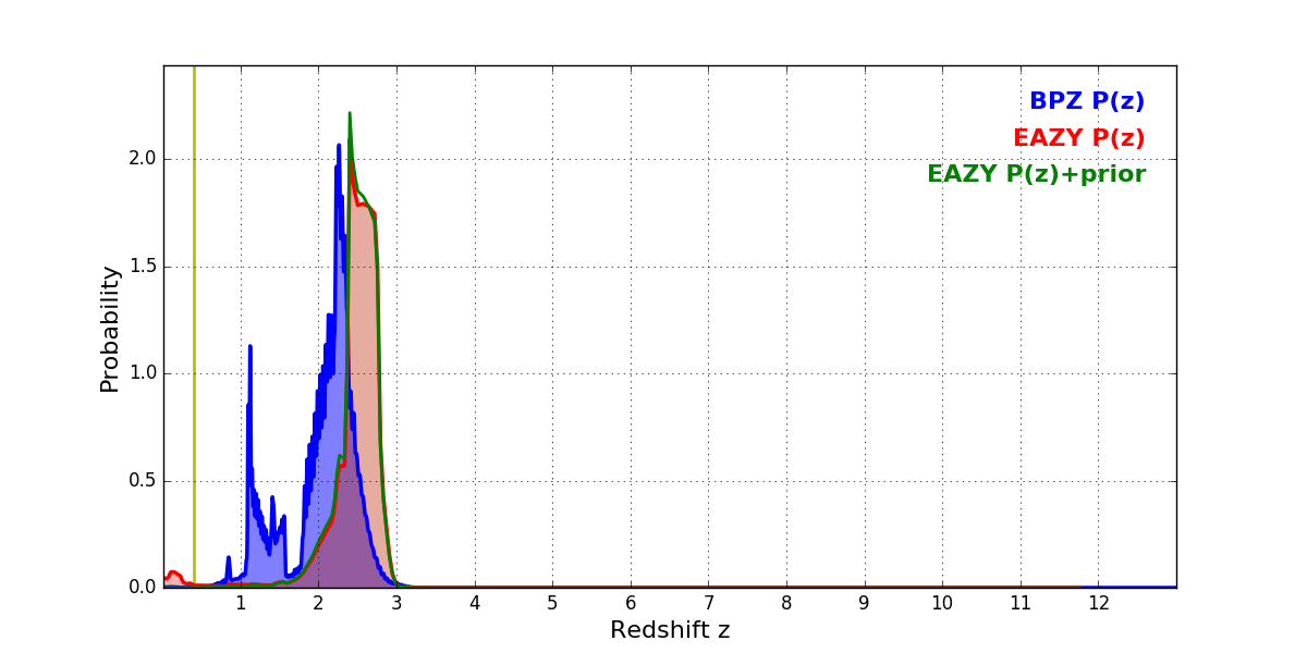 In P(z) plots: Yellow lines mark the cluster redshift z = 0.396,