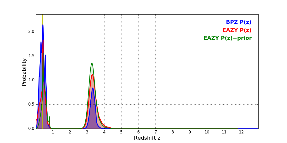 In P(z) plots: Yellow lines mark the cluster redshift z = 0.396,
