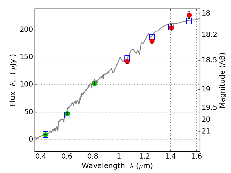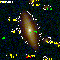 Object #256   x,y = (1886, 3034)   RA, Dec = (00:32:13.848, 18:08:24.72) = (8.05770, 18.14020)   BPZ = 0.340 [0.273--0.379]   type = 3.40 (Ell5_A_0 - Ell4_A_0)   stellarity = 0.03   chisq2 = 0.21   ODDS = 0.95   z_cluster = 0.396