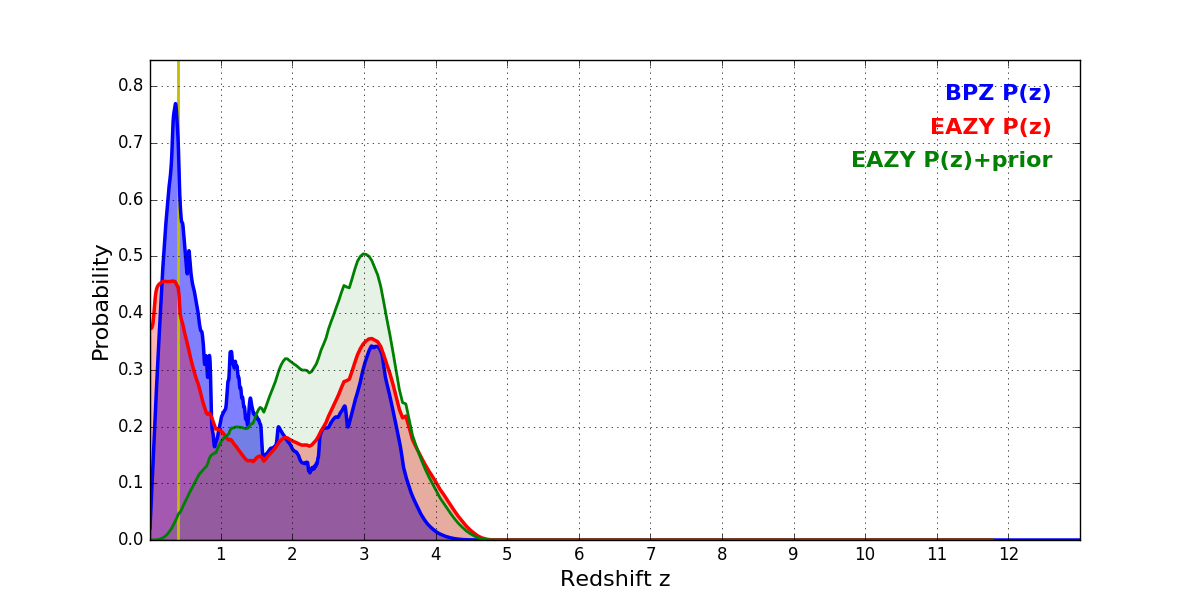 In P(z) plots: Yellow lines mark the cluster redshift z = 0.396,