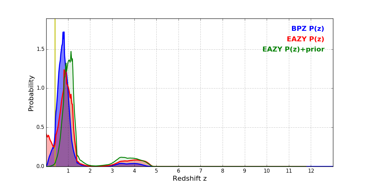 In P(z) plots: Yellow lines mark the cluster redshift z = 0.396,