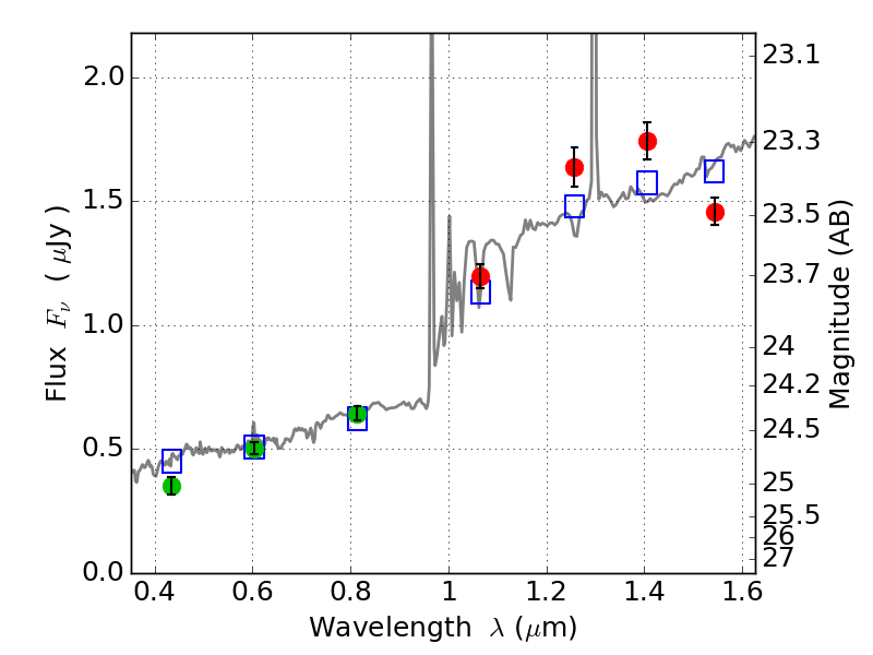 Object #345   x,y = (2527, 3050)   RA, Dec = (00:32:11.136, 18:08:25.80) = (8.04640, 18.14050)   BPZ = 1.592 [1.547--1.721]   type = 8.70 (SB2_B10 - SB1_B10)   stellarity = 0.03   chisq2 = 1.49   ODDS = 0.93   z_cluster = 0.396
