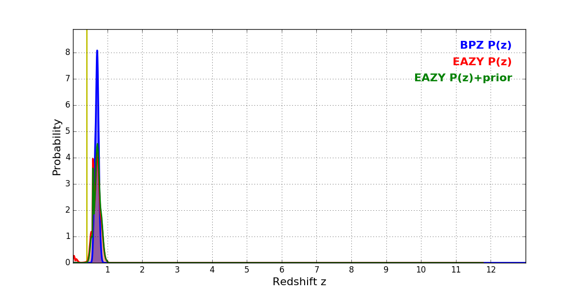 In P(z) plots: Yellow lines mark the cluster redshift z = 0.396,
