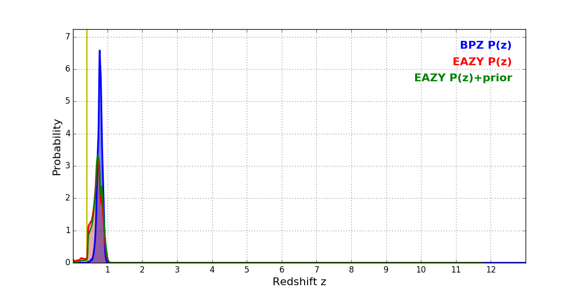 In P(z) plots: Yellow lines mark the cluster redshift z = 0.396,