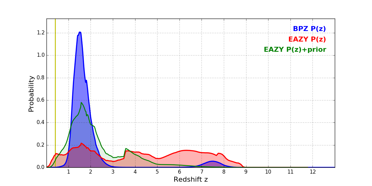 In P(z) plots: Yellow lines mark the cluster redshift z = 0.396,
