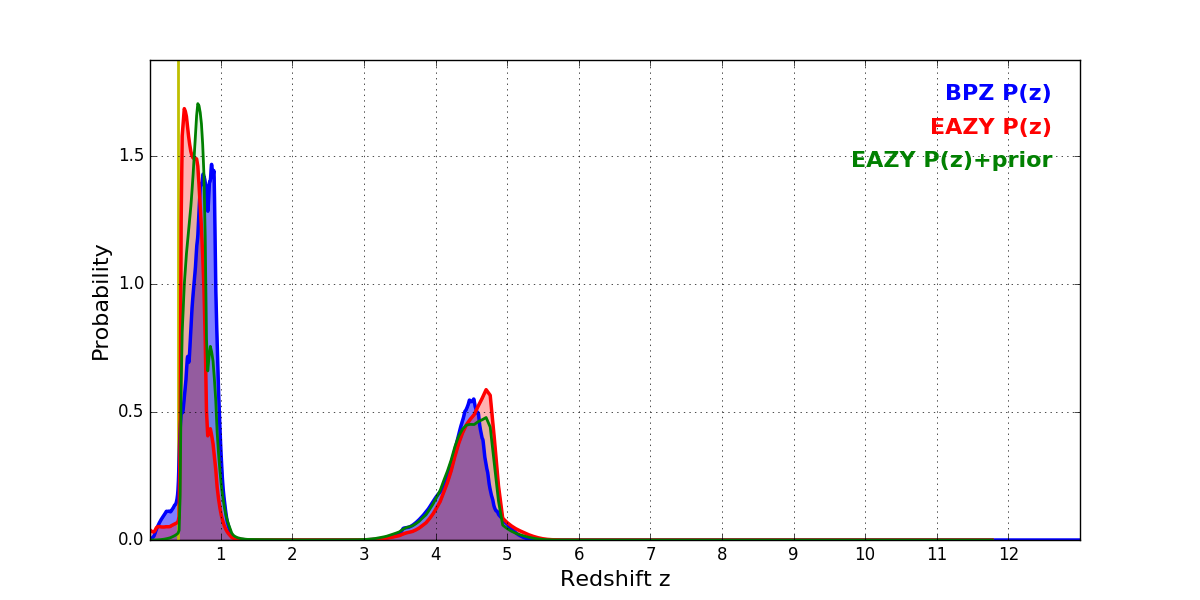 In P(z) plots: Yellow lines mark the cluster redshift z = 0.396,