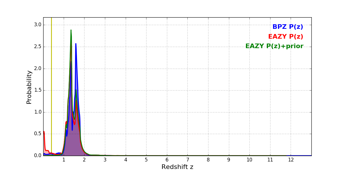 In P(z) plots: Yellow lines mark the cluster redshift z = 0.396,