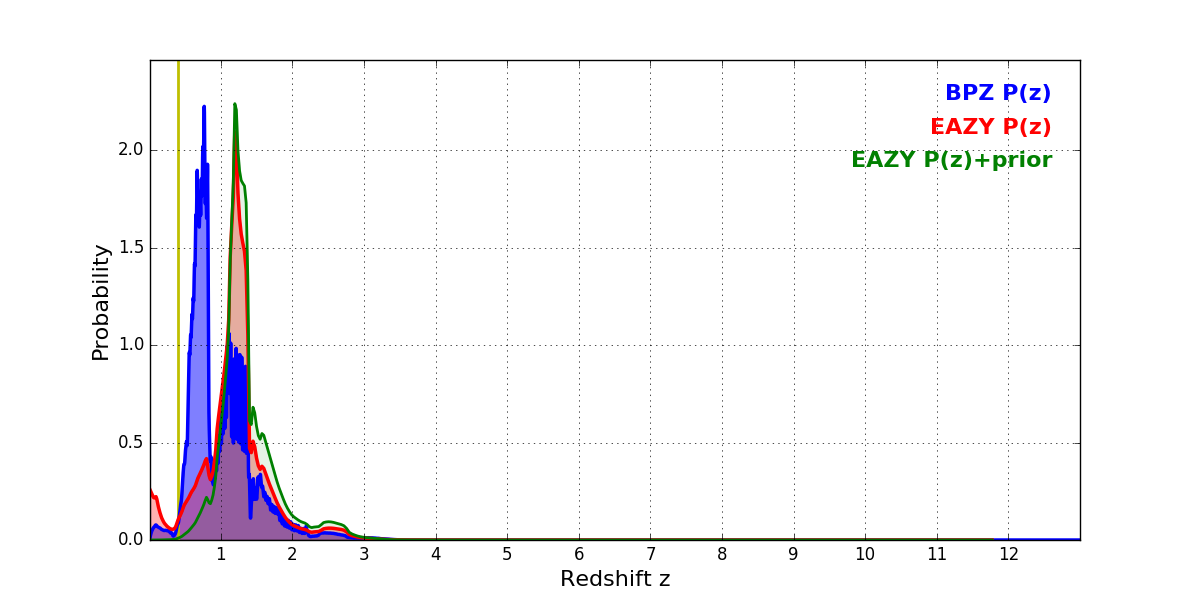 In P(z) plots: Yellow lines mark the cluster redshift z = 0.396,