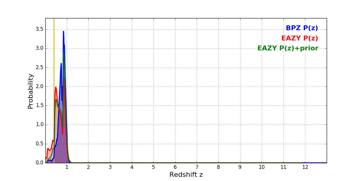 In P(z) plots: Yellow lines mark the cluster redshift z = 0.396,