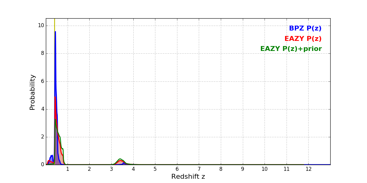 In P(z) plots: Yellow lines mark the cluster redshift z = 0.396,