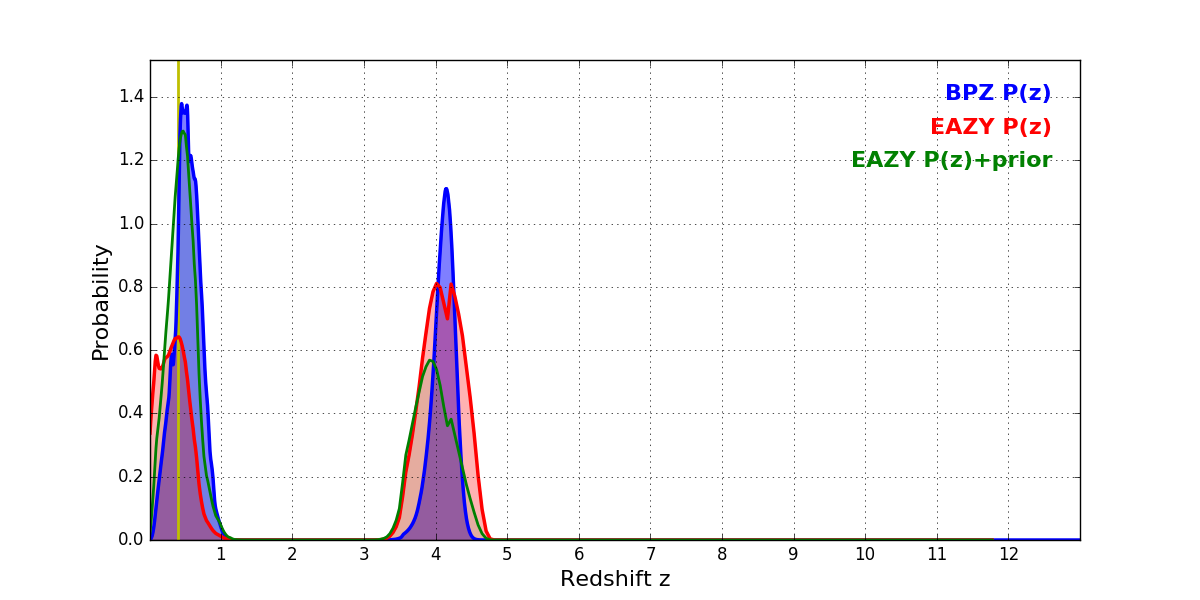In P(z) plots: Yellow lines mark the cluster redshift z = 0.396,