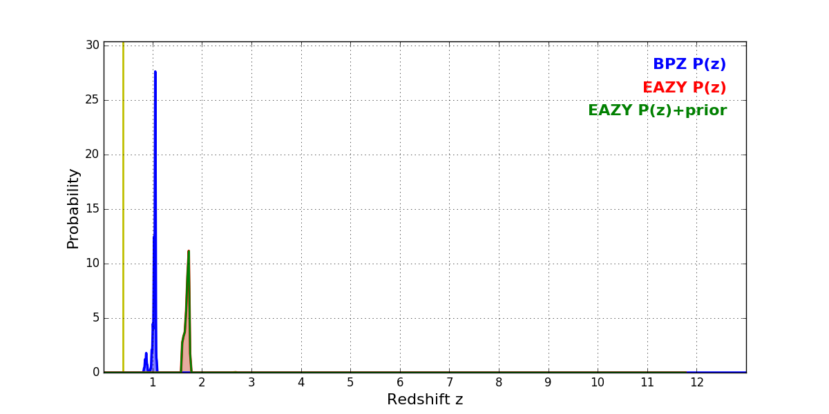 In P(z) plots: Yellow lines mark the cluster redshift z = 0.396,
