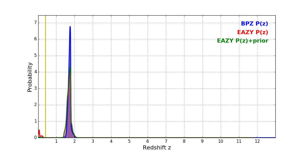 In P(z) plots: Yellow lines mark the cluster redshift z = 0.396,
