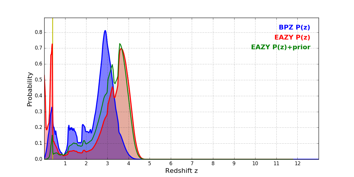 In P(z) plots: Yellow lines mark the cluster redshift z = 0.396,