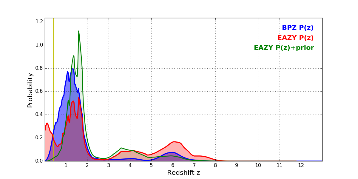 In P(z) plots: Yellow lines mark the cluster redshift z = 0.396,