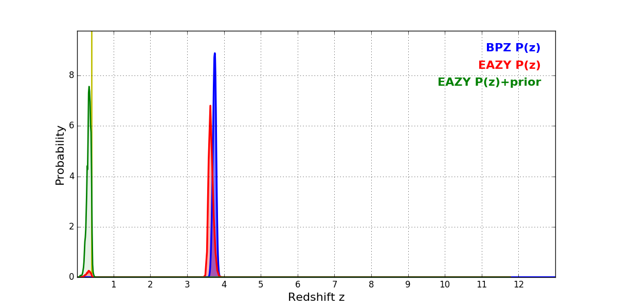 In P(z) plots: Yellow lines mark the cluster redshift z = 0.396,